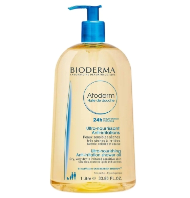 Atoderm Huile de douche apaise la peau sèche et sensible, grâce à sa formule exclusive composée de biolipides végétaux, de vitamine PP et du brevet Skin Barrier Therapy.