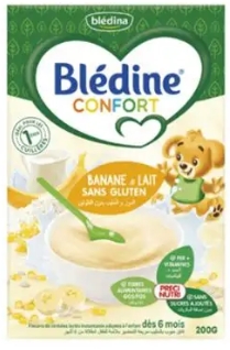 La BLEDINE Banane et lait est une céréale infantile sans gluten, conçue pour les bébés dès 6 mois. Elle contient des ingrédients tels que farine de blé, lait écrémé, et flocons de banane.